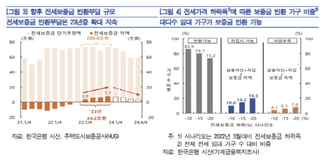 전세보증금 반환에 어려움을 겪는 집주인들한은의 보고서에 따르면, 전세 시장에서 전세보증금 반환 대란이 예상되고 있습니다. 집주인들은 전세보증금을 반환해야 하는데 이를 위해 예금이나 주식을 처분하거나 추가로 빚을 내야 할 상황입니다. 그러나 일부 집주인들은 총부채원리금상환비율(DSR) 40% 규제에 막혀 빚을 최대한 내더라도 보증금을 반환하기 어려울 것으로 평가되고 있습니다.